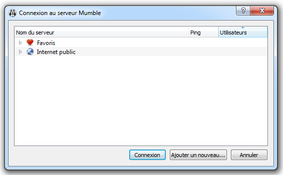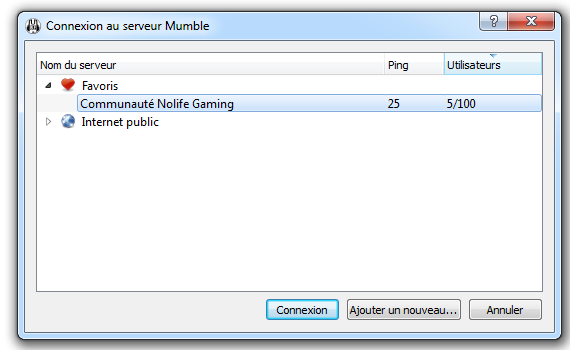 - Arrivé sur Mumble, vous allez avoir une fenêtre "Connexion au serveur Mumble" avec une liste de serveurs en favoris (avec un cœur) et une autre liste Internet Public (avec un globe terrestre) regroupant des serveurs Mumble publics.